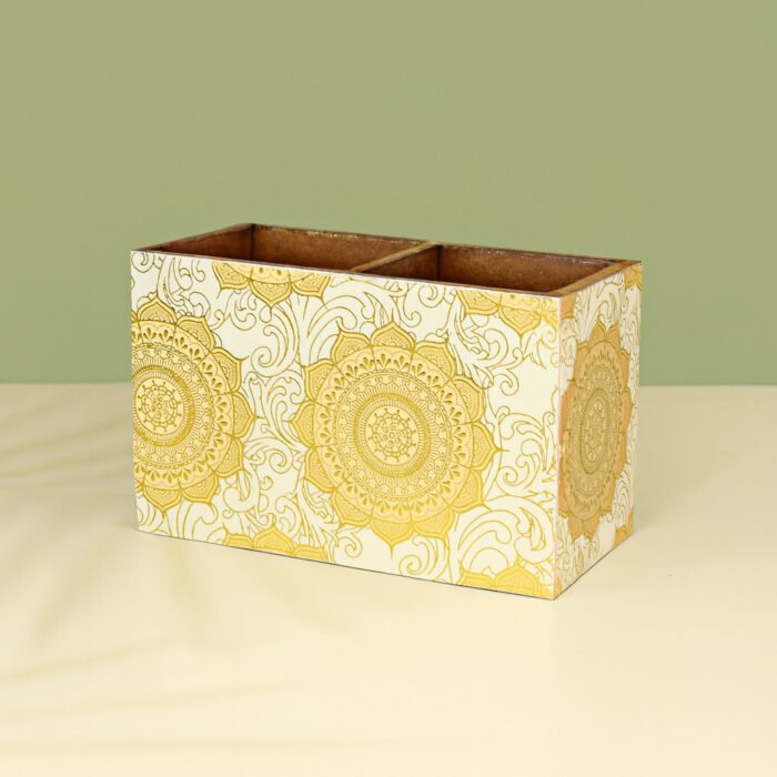 A multipurpose Organizer for cutlery to keep at the table or in Kitchen, made up of high quality MDF and with resin coating for strengthening the product and keep the quality intact. The Gold Foil printing adds luxury to your beautiful home.