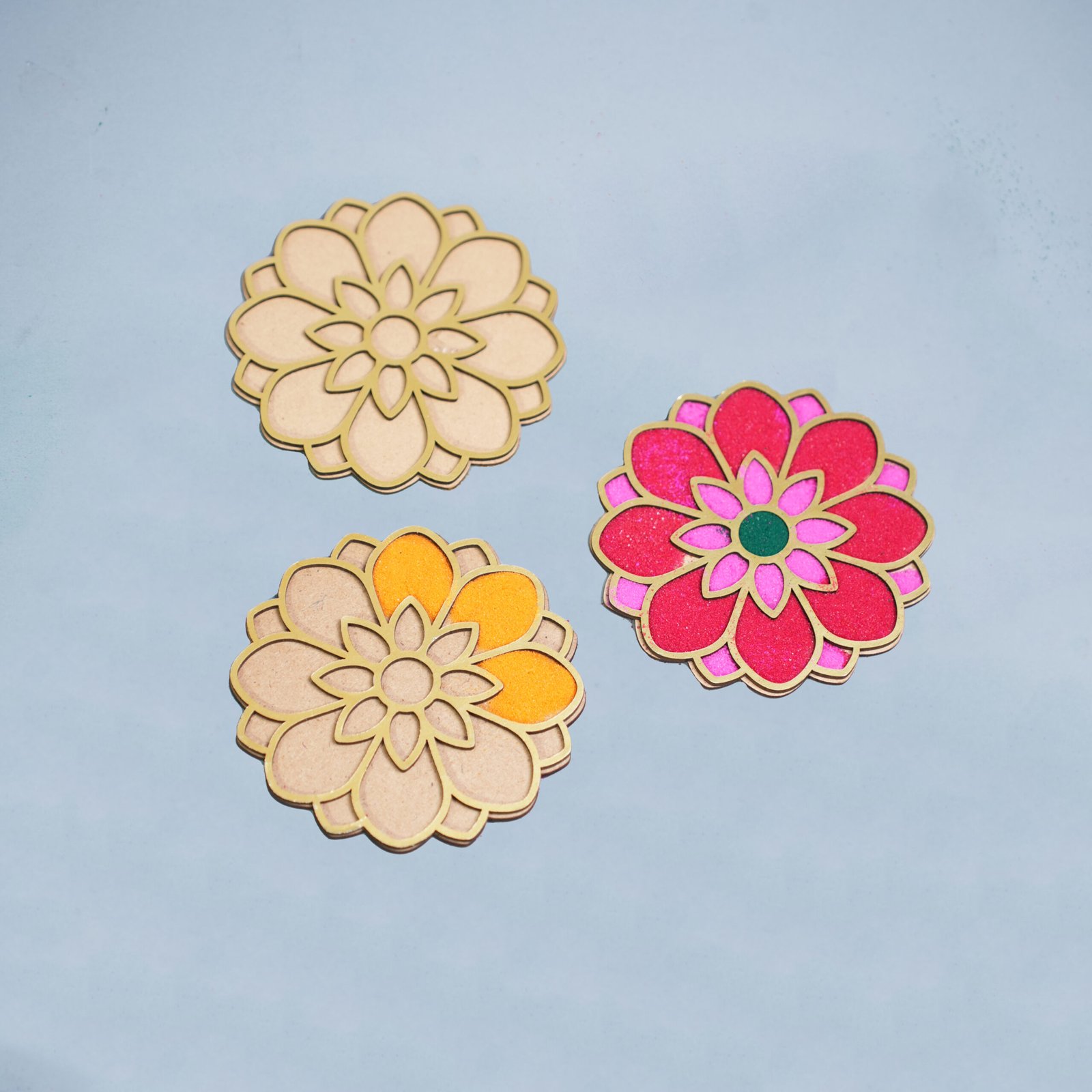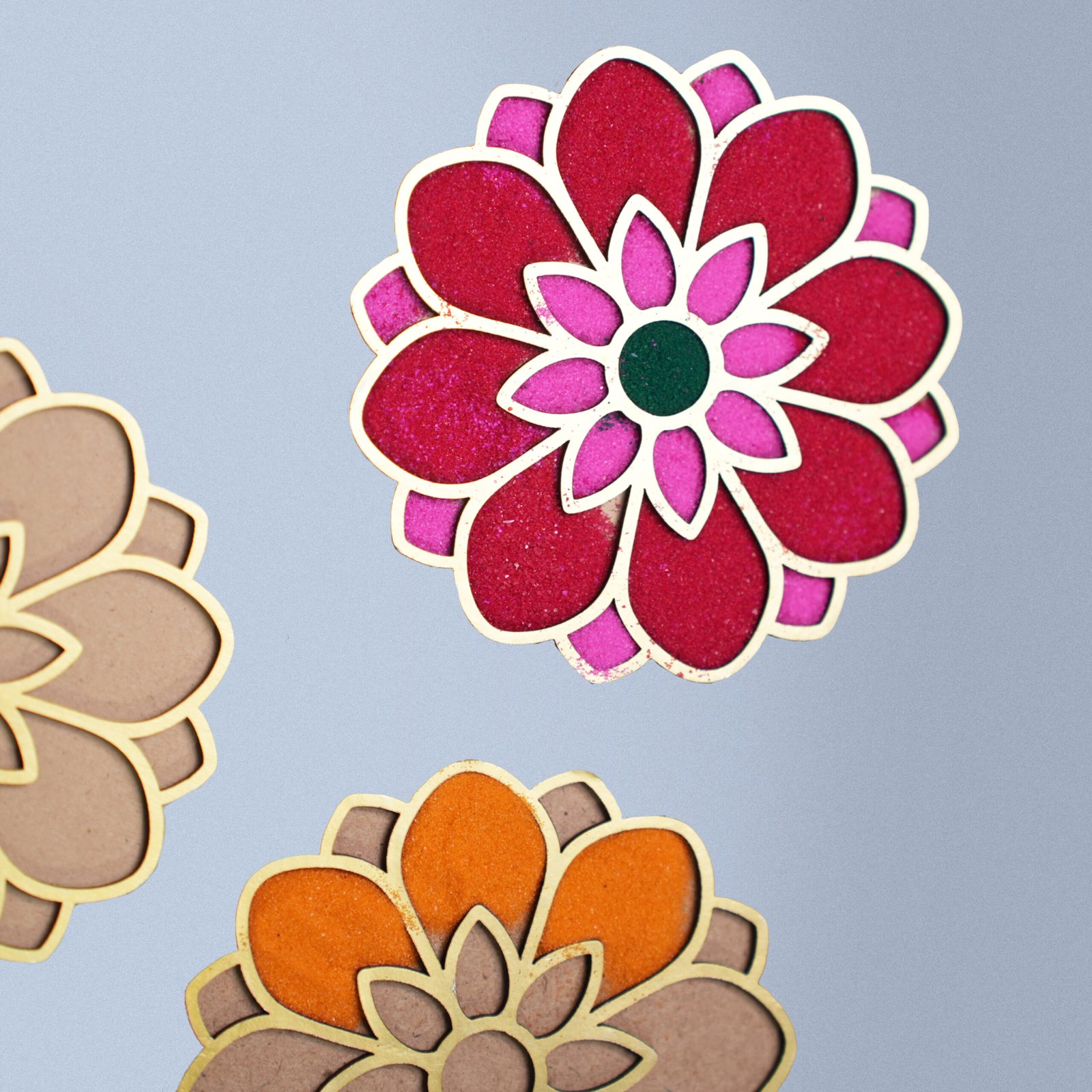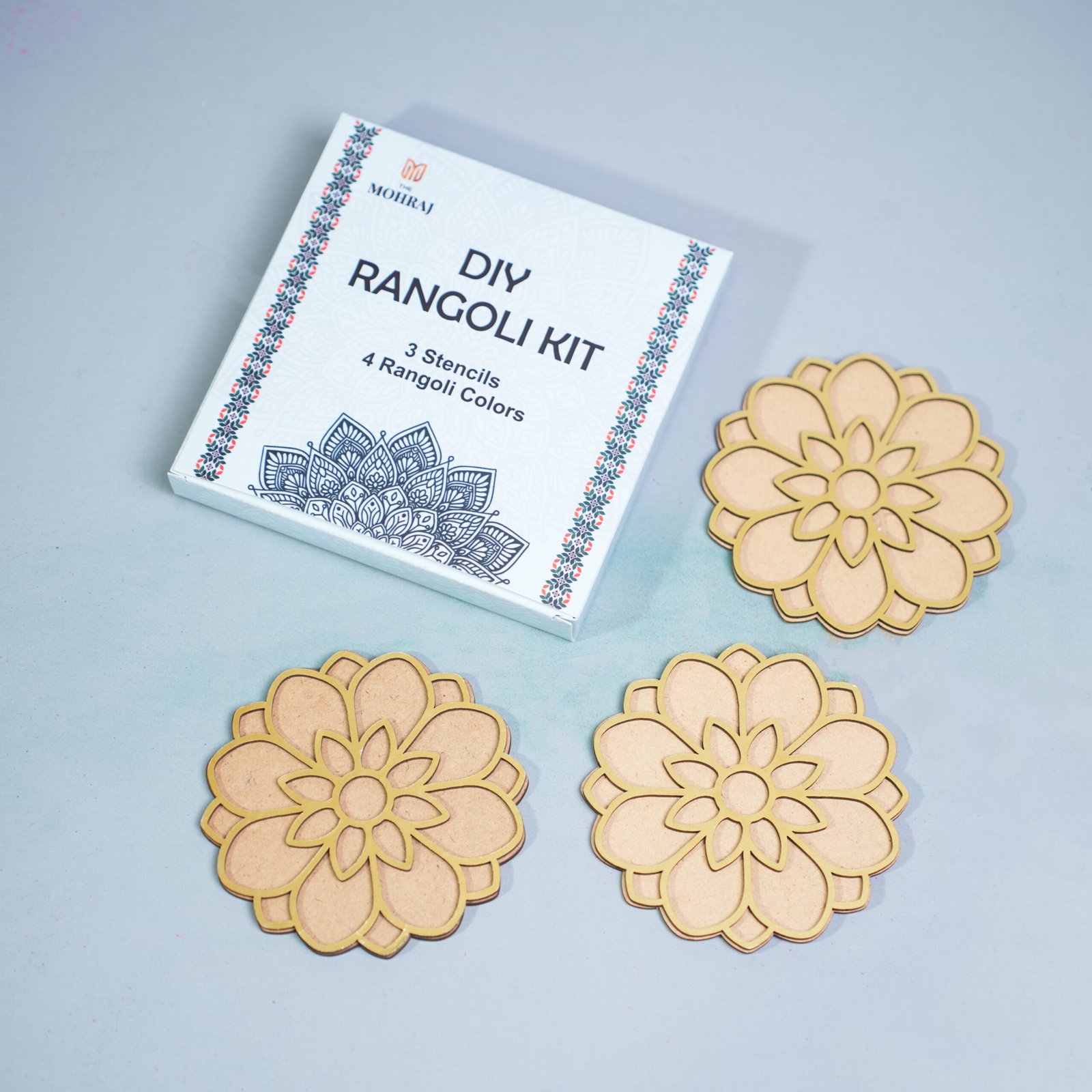 Includes: 3 Artisanal reusable stencils + 4 Premium rangoli colors